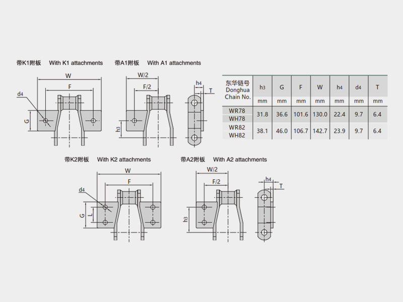 ● 工程用焊接結構彎板鏈按照ASME B29.16M《鋼制焊接工程鏈、附件和鏈輪齒形》和ISO 6972《焊接結構工程用彎板鏈、附件和鏈輪》設計和制造,有多種附件可供選擇,也可以按照用戶需求進行定制開發。